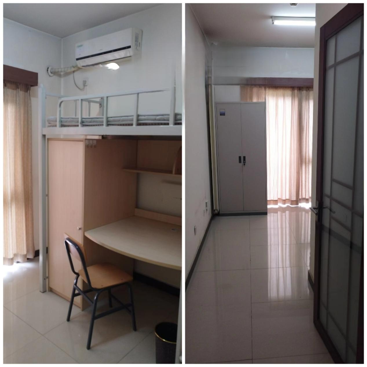 Shahe campus student flat offers a separated bathroom. Hot water is provided from 16:00-22:00 every day. Each room is equipped with air conditioner, TV cable desks, bookcase, wardrobe, single bed, internet cable, and a walk-in balcony.