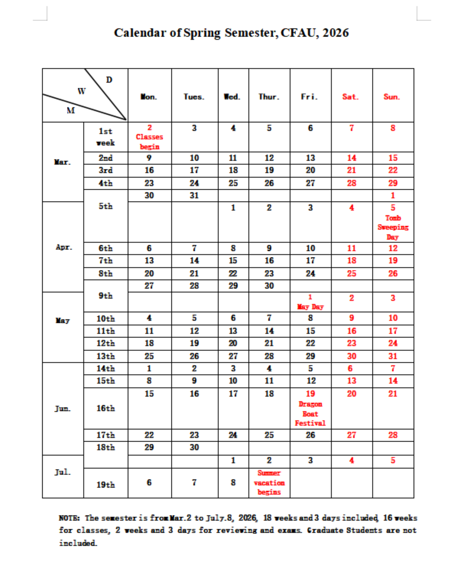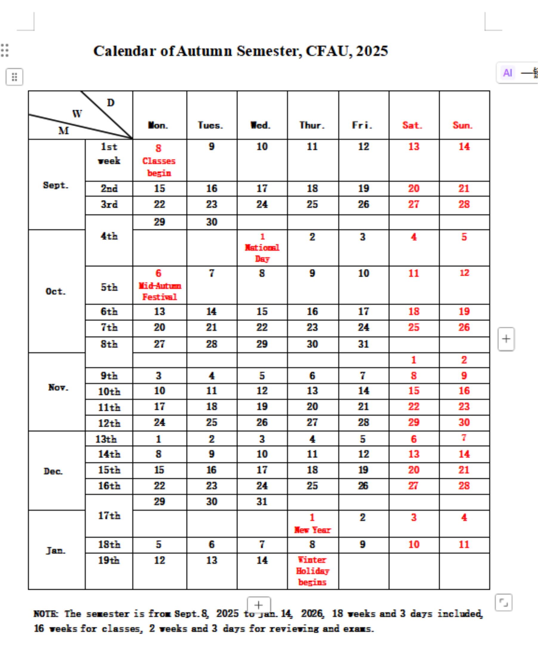 Calendar of CFAU, 2025-2026